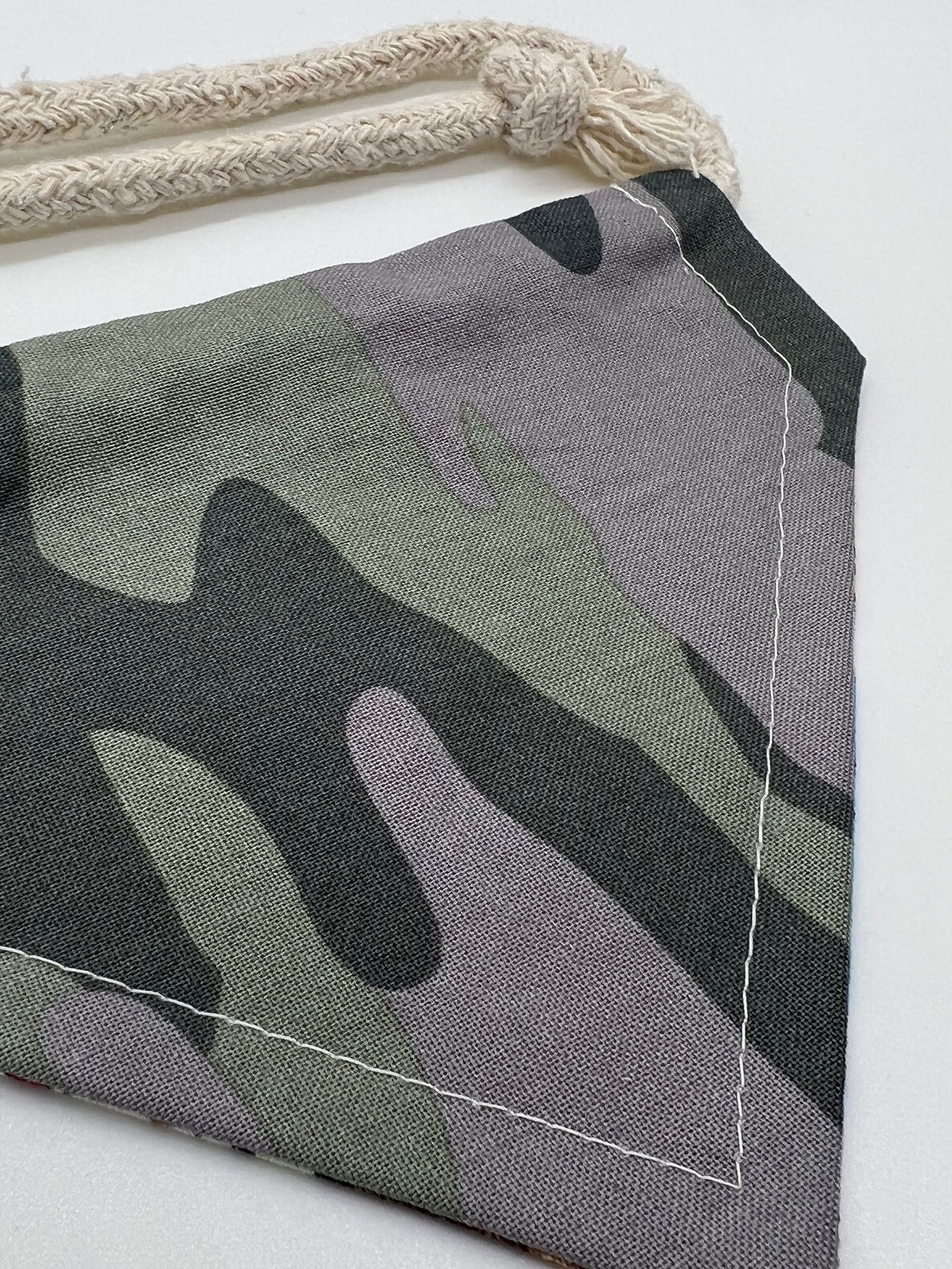 Camouflage print reverses to a nature and camping print. Great year round everyday bandana! Tie-rope closure.